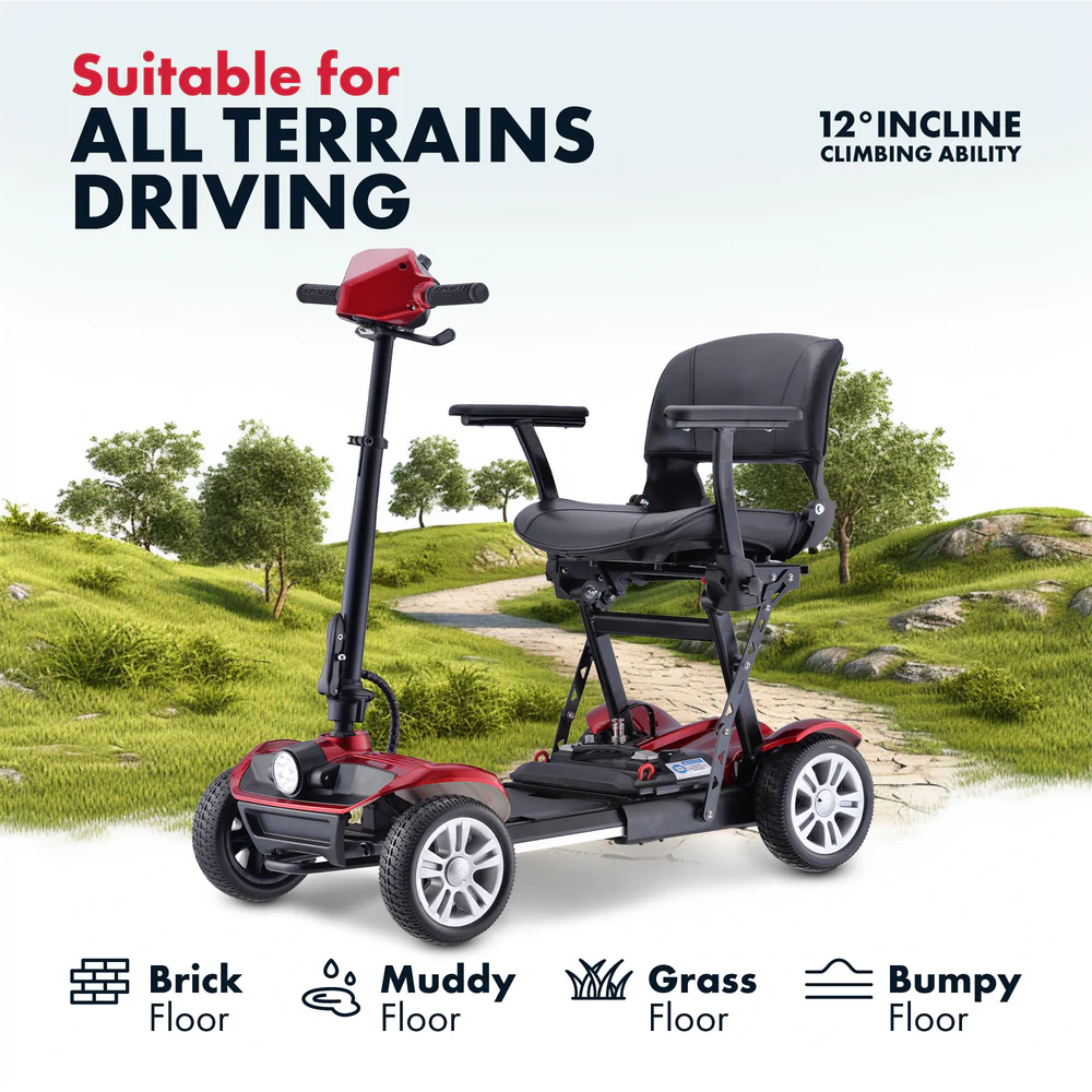 Discover the perfect balance of durability and convenience with the Rubicon FX01 from SriDe Mobility. This lightweight, foldable mobility scooter is engineered for smooth indoor surfaces and rough outdoor terrains, ensuring a versatile, comfortable ride wherever you go.